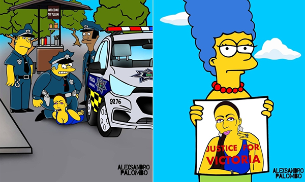 En la serie de ilustraciones, compartidas en su cuenta de Instagram, se aprecia el momento en que Victoria Salazar es sometida por tres policías, incluido el famoso jefe Wiggum, comandante en Springfield, además, se observa al presidente Andrés Manuel López Obrador y a Marge Simpson sosteniendo pancartas con el reclamo de justicia para la migrante.