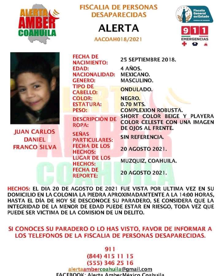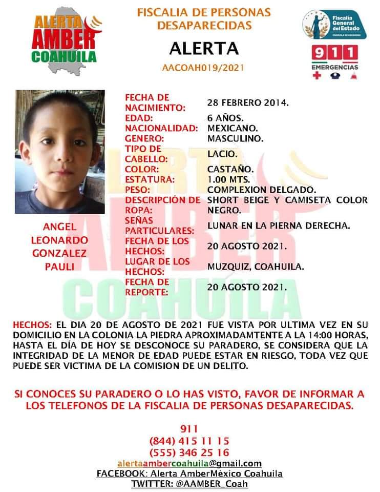 La Fiscalía de Personas Desaparecidas, emitió la Alerta Amber Coahuila, por la no localización de los niños: Ángel Leonardo González, de seis años y Juan Carlos Daniel Franco de cuatro años. Los menores salieron de su casa ubicada en el Barrio La Piedra en Múzquiz, desde el viernes por la mañana y a 24 horas de su extravío, no han sido ubicados.
