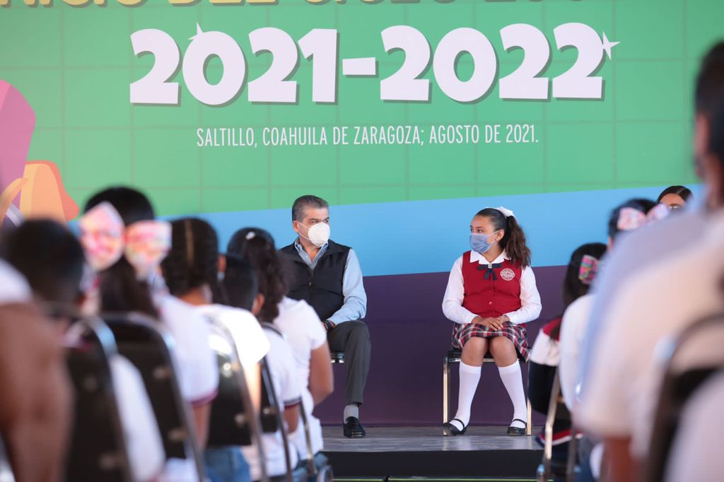 En el que dijo es un “día histórico para el sistema educativo de Coahuila”, el gobernador Miguel Ángel Riquelme Solís encabezó la ceremonia del inicio del Ciclo Escolar 2021-22 en la entidad, en donde informó que en esta semana 91 mil 606 alumnos y 4 mil 787 docentes de 434 escuelas de nivel básico regresan a las clases en forma semi-presencial.