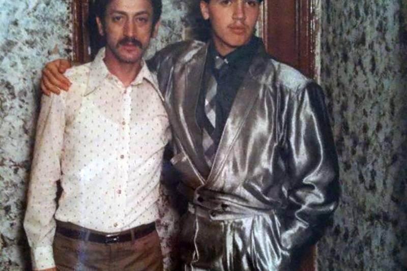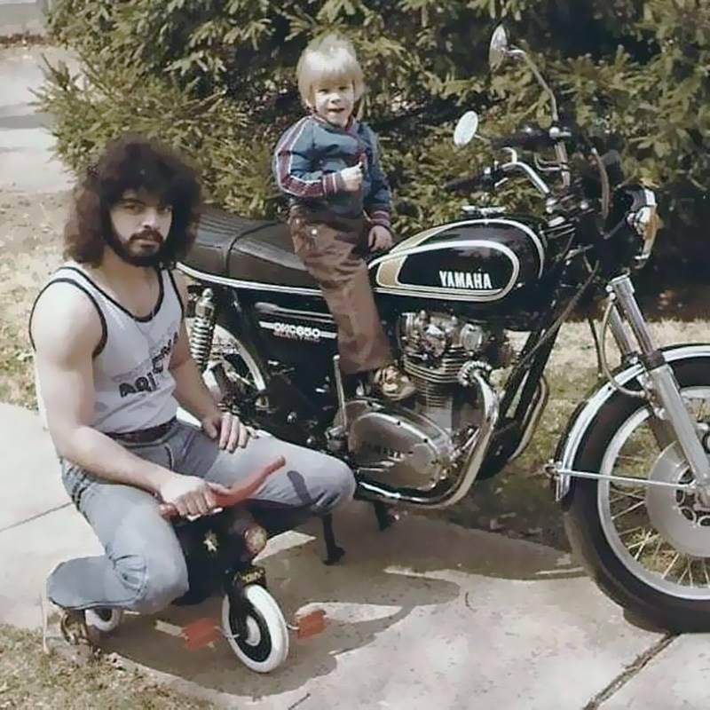 Échale un vistazo a este look total de padre e hijo en los años 80´. Ambos representan un estilo de ropa y de cabello de la década, y están encima de increíbles motocicletas.