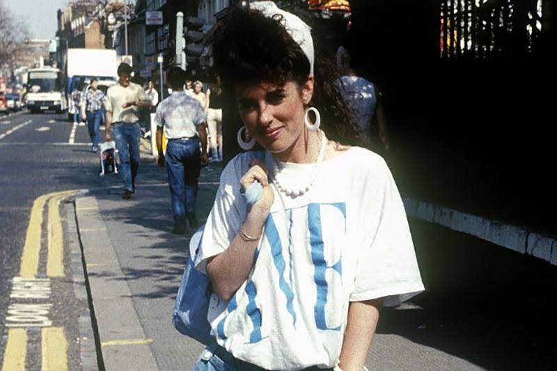 No podemos decidir qué es más sencillo de notar, si el pantalón con tela de jean o la gran cabellera de esta mujer. Las faldas de jean se han desvanecido de las últimas corrientes de moda, pero si bien aún las podemos ver en algunas personas, no cuentan con esos largos bolsillos que aparecían en los años 80´.