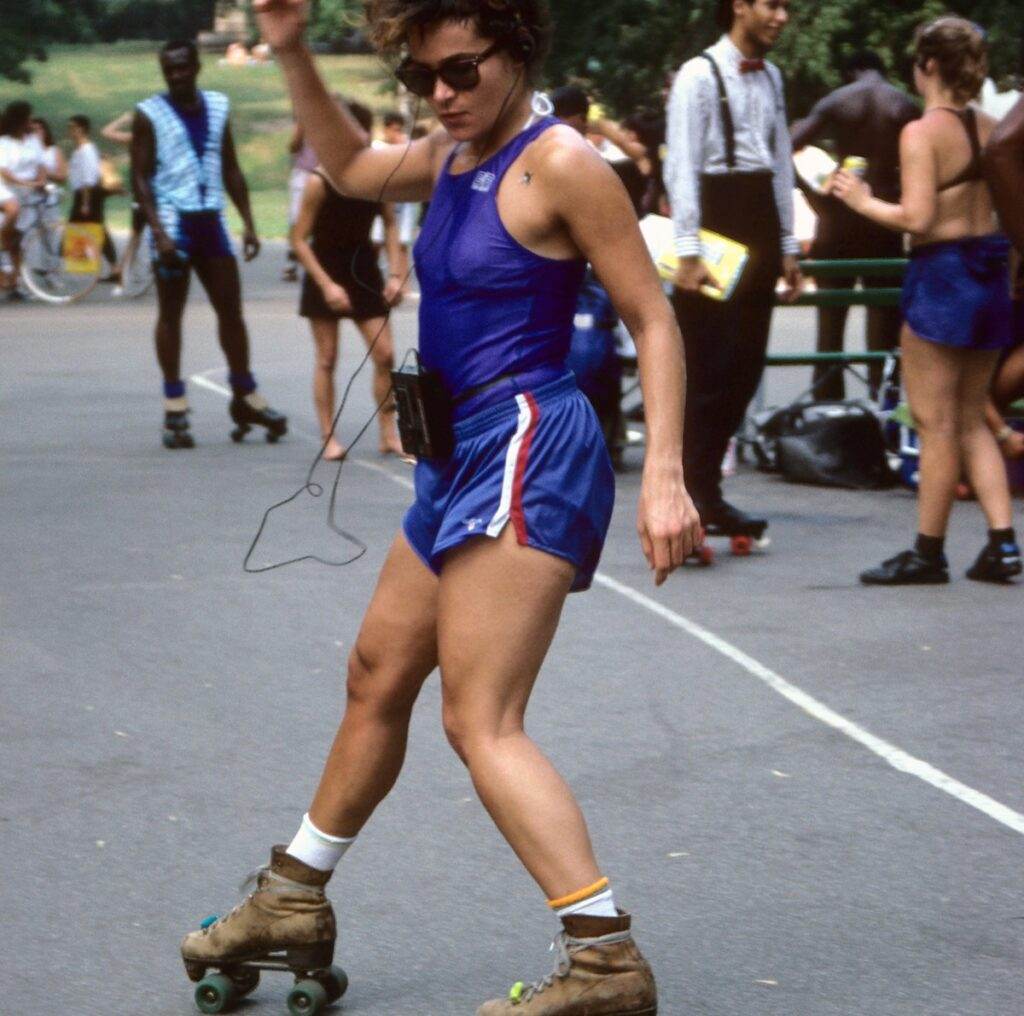 En esta fotografía, puedes ver a una mujer patinando sobre rollers en el exterior mientras escucha su Walkman, el cual está encajado en su pretina. Ella no parece tan alejada a los jóvenes de la actualidad, que tienen sus auriculares enchufados a sus celulares inteligentes.