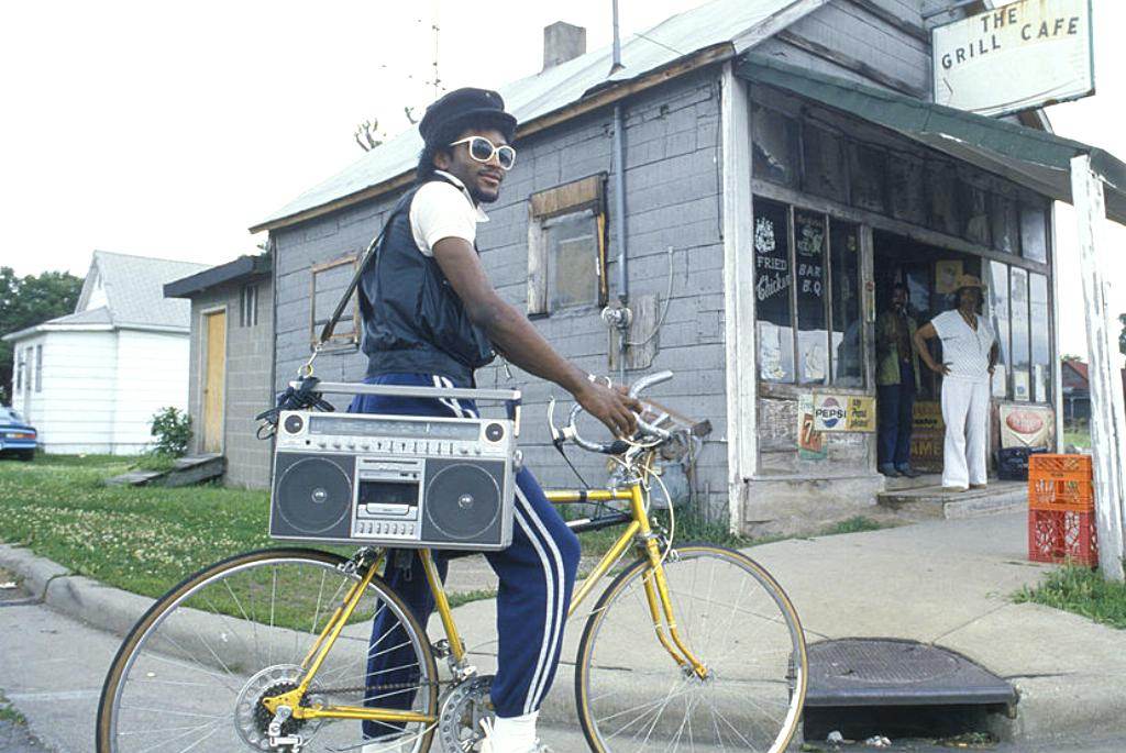Previo al Walkman, la única manera en la que podías escuchar tu propia música cuando estabas fuera de casa era llevando contigo un boombox gigante. Este hombre tiene una tira en su boombox por lo que puede conducir su bicicleta y escuchar sus tus temas favoritos.