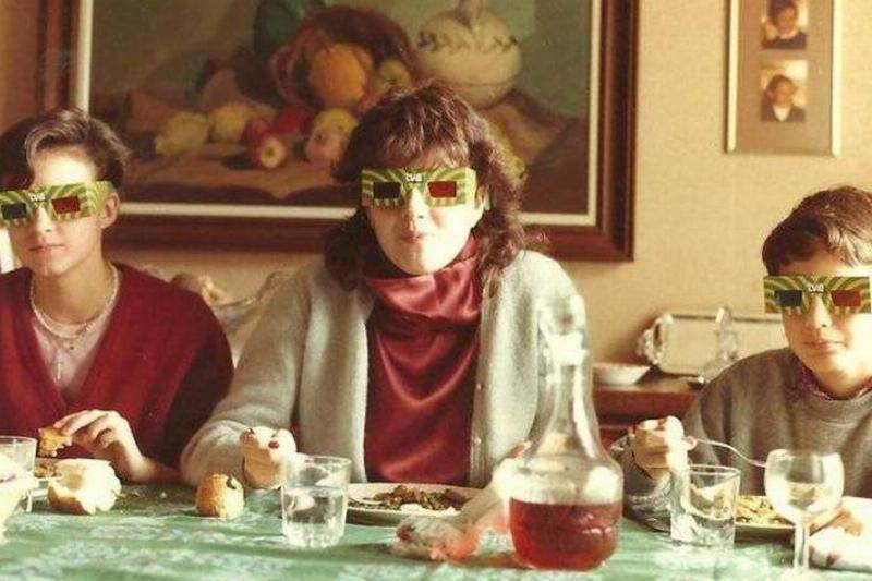 Aquí, podemos ver a una familia que bromea mientras es la hora de la cena y aún lucen sus anteojos de 3D que consiguieron en alguna parte de su hogar. ¡O que quizás hayan llevado a su casa luego de una película!
