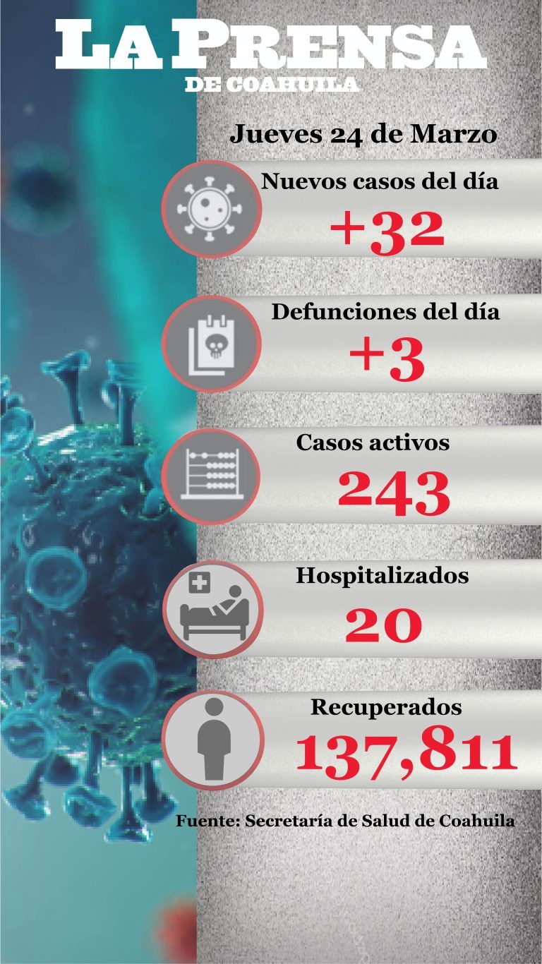 MUEREN 3 POR COVID 19 EN COAHUILA Y SURGEN 32 NUEVOS CASOS