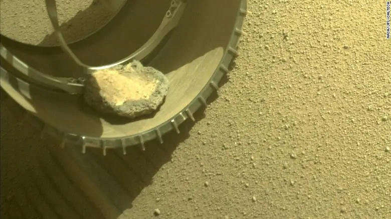 El rover Mars Perseverance ganó un nuevo compañero de viaje cuando una roca se subió a su rueda hace cuatro meses mientras exploraba el cráter Jezero.