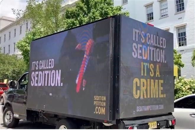 Una camioneta circula por calles de Washington llamando a los estadounidenses a firmar una petición para procesar al ex Presidente Donald Trump por conspiración sediciosa tras ataque al Capitolio, ocurrido en 2021.