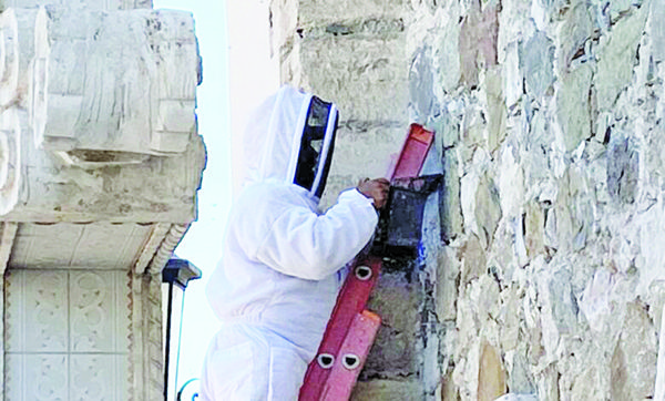 SALTILLO, COAHUILA. – Elementos de la Policía Ambiental de Saltillo continuaron con los trabajos para retirar el enjambre de abejas este viernes, el cual se encuentra a un costado de la capilla del Santo Cristo, donde el párroco Placido Castro Zamora estuvo presente.