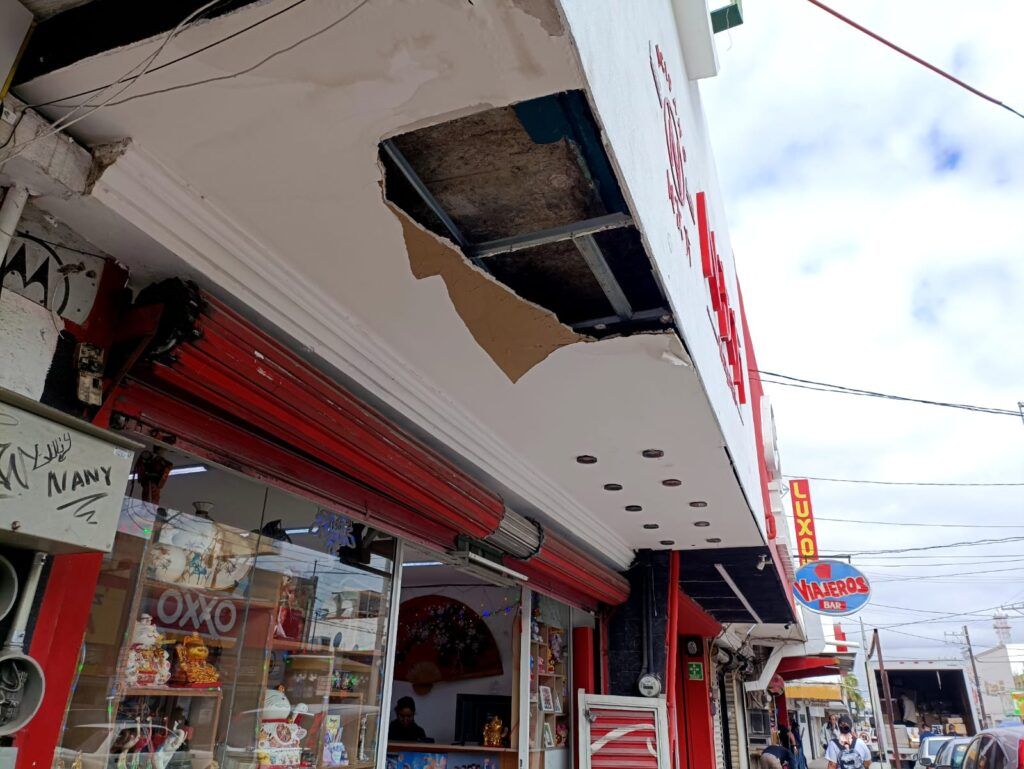 Sobre la calle Hidalgo en la Zona Centro es que los plafones de las techumbres que cubren el pasillo por donde circulan los peatones se desplomaron dejando al descubierto cierta parte de la estructura del mismo, evidenciando que los daños permanecen en la zona, representando aún un riesgo para los que transitan por dicha área.