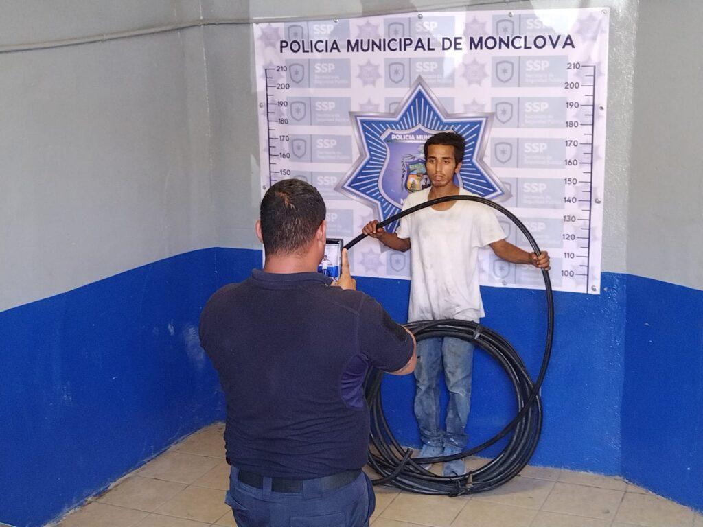 Un joven fue detenido y llevado a las calurosas celdas municipales tras ser sorprendido cargando varios metros de cableado de Telmex. El incidente ocurrió alrededor del mediodía de ayer en la calle Nísperos de la colonia Del Río.