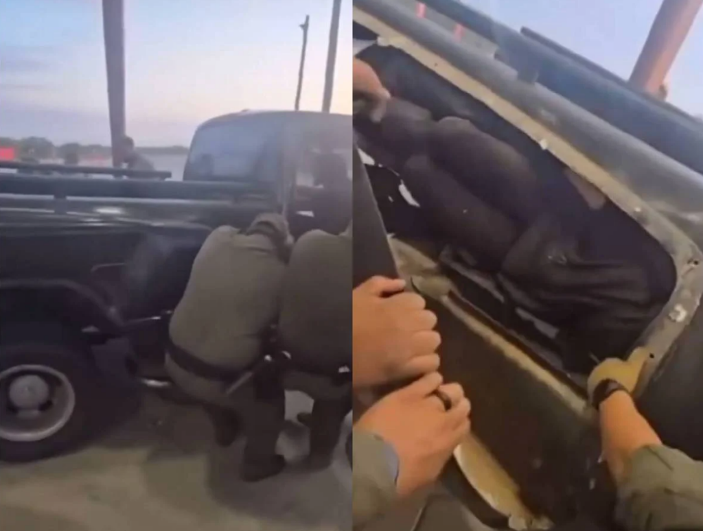 El clip, de aproximadamente 30 segundos, revela el momento en que, al retirar latas que cubrían la batea de la camioneta, los uniformados hallaron a varios migrantes ocultos en su interior.