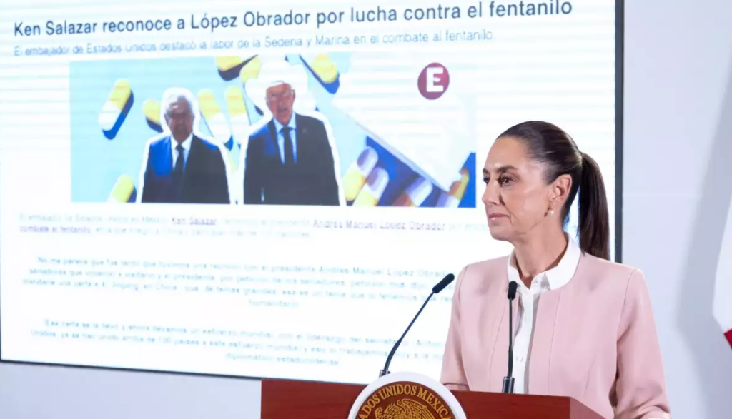 Sheinbaum Pardo exhibió en el salón Tesorería declaraciones anteriores del diplomático estadounidense, en las cuales resaltaba la lucha del gobierno de Andrés Manuel López Obrador contra el tráfico de fentanilo.