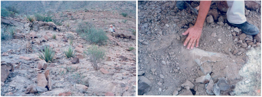 Se hizo de noche, tuvimos que interrumpir la exploración del área, y acampamos ahí mismo. Al día siguiente, después de un buen almuerzo, seguimos las caminatas por la sierra. Luego encontramos el extremo de un hueso, que salía de un costado de la loma: empezamos a limpiarlo, y descubrimos que no era solo un pequeño pedazo suelto de hueso, pero algo más grande que se extendía hacia el interior de la loma. Por su tamaño, sospechamos que podría ser el fémur fosilizado de un hadrosaurio, el dinosaurio más común en esta región. Lamentablemente desde los años 80’s en Mexico se prohibieron las excavaciones, y no pudimos evaluar la extensión del hallazgo.
