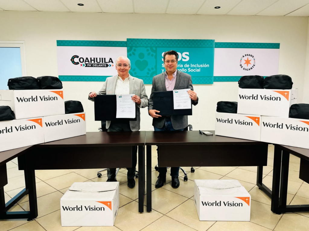 Saltillo, Coahuila de Zaragoza; a 28 de febrero de 2025.- Como parte del compromiso del gobernador Manolo Jiménez de fortalecer a las familias coahuilenses, se formalizó el Programa de Desarrollo Institucional para la Reducción de la Pobreza Alimentaria mediante la firma de un convenio de colaboración entre el secretario de Inclusión y Desarrollo Social, Enrique Martínez y Morales, y el consejero del Banco Internacional de Alimentos A.C., José Martín Faz Ríos.