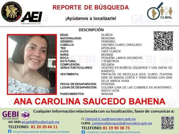 Ana Carolina Saucedo Bahena, estudia en la Universidad del Valle de México (UVM), desapareció desde el pasado viernes en Monterrey, Nuevo León Por Aracely Garza...