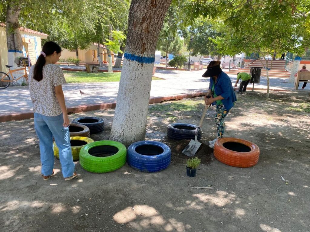 De igual manera, se reutilizaron llantas provenientes del relleno sanitario, mismas que fueron transformadas en coloridas macetas, demostrando que el reciclaje puede convertirse en una herramienta útil para mejorar los espacios públicos y darles una nueva vida.