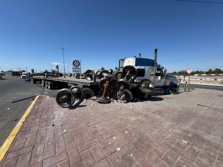 Cargado con pesadas ruedas de ferrocarril frena bruscamente al atravesarse camioneta. La violencia del choque provocó que los amarres de la carga reventaran y las...