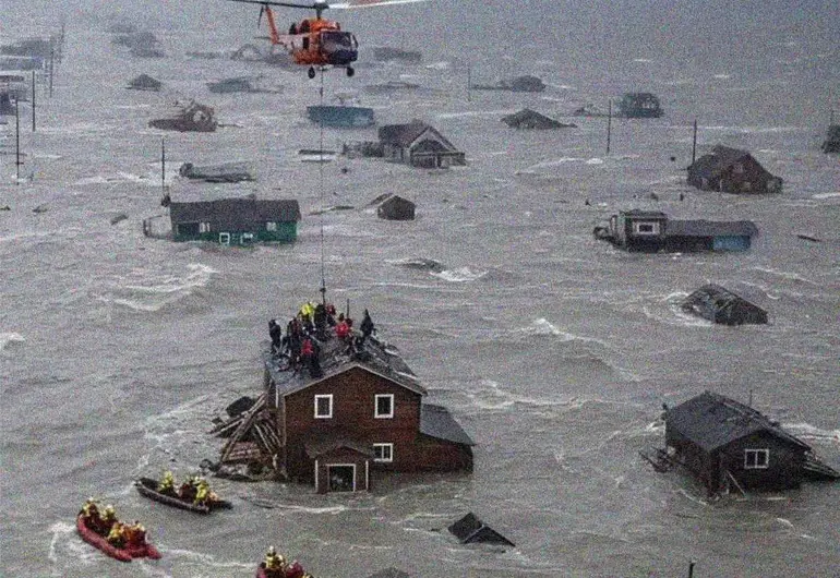 Alaska realiza un puente aéreo histórico tras la marejada ocasionada por el paso del tifón; también hay dos desaparecidos y 121 casas destruidas.