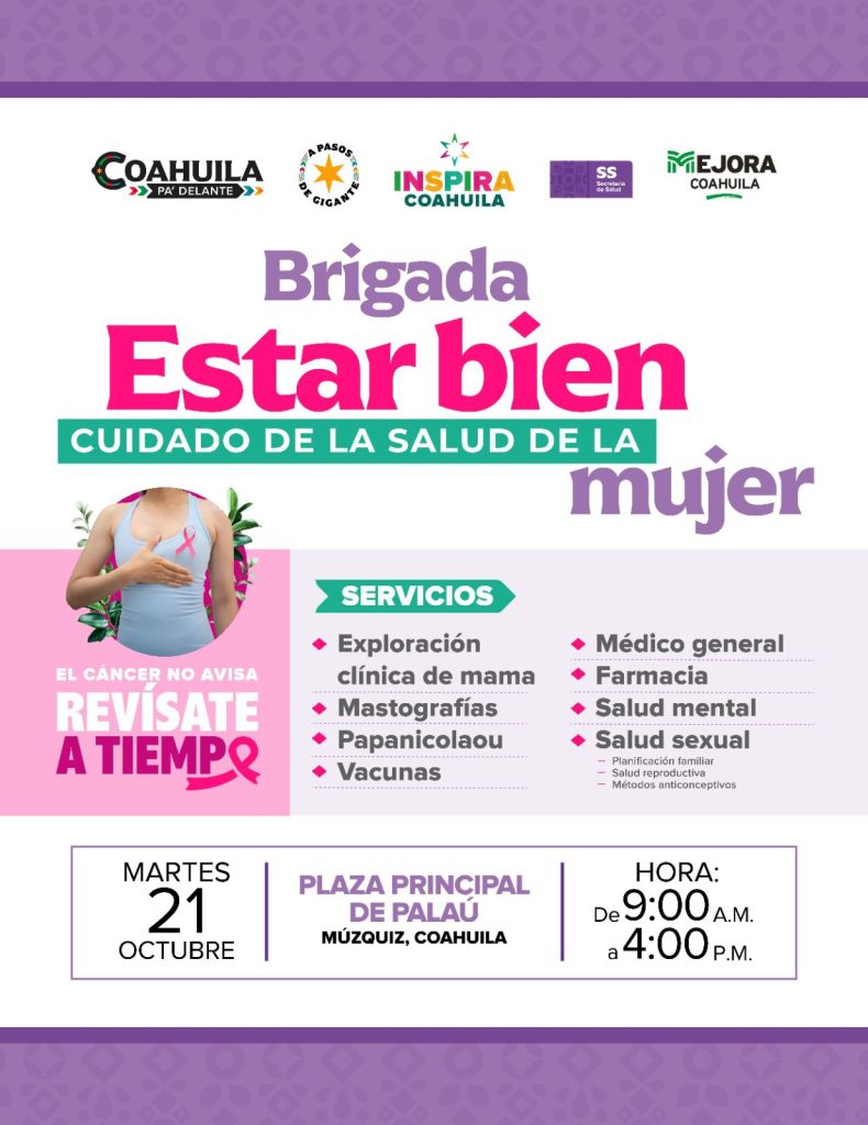 MÚZQUIZ, COAHUILA. – Con el objetivo de fortalecer la atención médica preventiva, el Gobierno del Estado de Coahuila, a través de INSPIRA Coahuila y la Secretaría de Salud, en coordinación con el Gobierno Municipal de Múzquiz, invitan a la Brigada “Estar Bien: Cuidado de la Salud de la Mujer”.