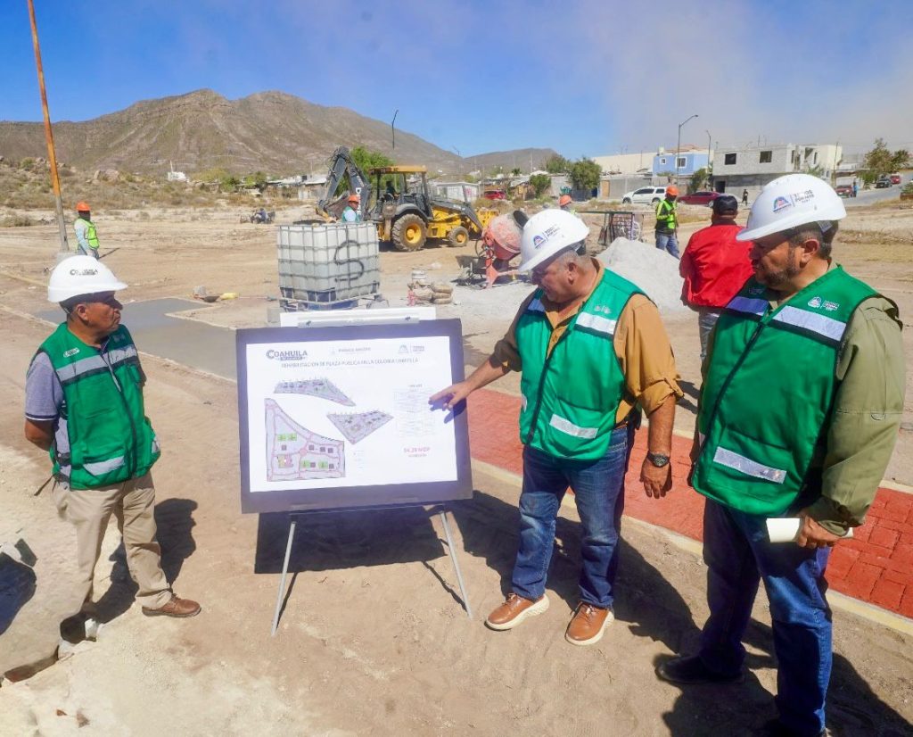 RAMOS ARIZPE, COAHUILA.- El alcalde Tomás Gutiérrez Merino encabezó este martes la supervisión de la construcción de la plaza pública en la colonia Urbivilla del Real, obra dentro de la estrategia “Con Obra Tras Obra Ramos se Transforma”.