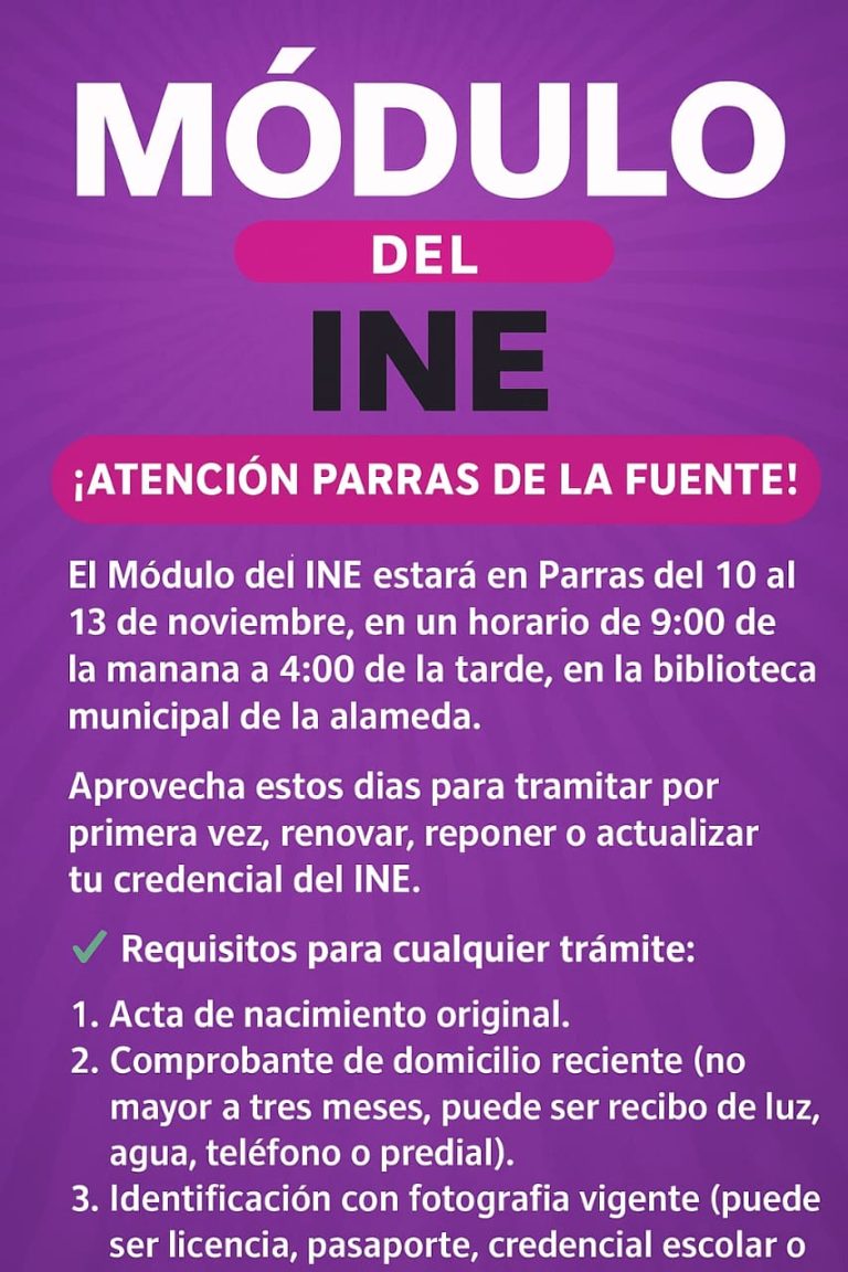 Oportunidad única para realizar trámites de la credencial de elector en Parras. Horario de 9:00 a 4:00. Lleva acta de nacimiento, comprobante de domicilio e...