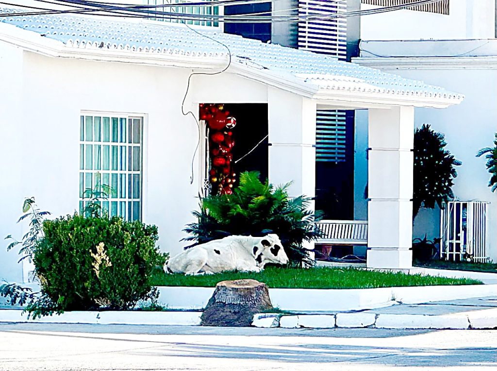 Una vaca cómodamente echada en el jardín de una casa ubicada en la colonia Petrolera causó sensación entre automovilistas y estudiantes que regresaban de sus colegios, quienes le hicieron sesiones de fotos, convirtiendo el momento en un inusual espectáculo muy parecido a las estampas de Navidad.