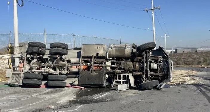 RAMOS ARIZPE, COAHUILA. – La mañana de este martes se registró un aparatoso accidente sobre el bulevar Industria de la Transformación, en pleno Parque Industrial Ramos Arizpe, luego de que una unidad tipo cisterna dedicada al desazolve terminara volcada tras maniobrar una curva presuntamente a exceso de velocidad.