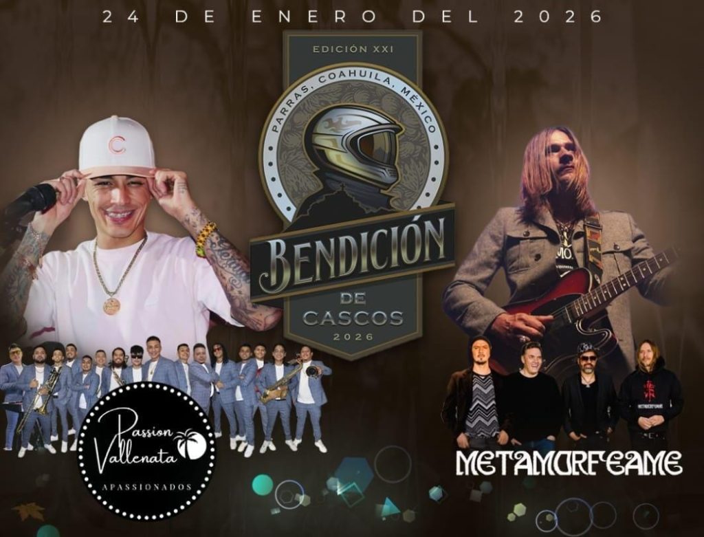 PARRAS, COAHUILA.– El rugir de los motores y la música volverán a apoderarse de Parras de la Fuente con la Bendición de Cascos 2026, evento que ya confirmó a los grupos Metamorféame y Pasión Vallenata como parte del Concierto BDC, programado del 23 al 25 de enero.