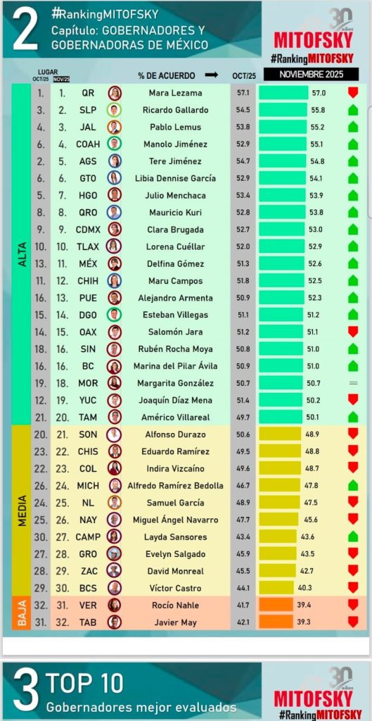 De acuerdo a la consultora Cipreso, en su evaluación de la gestión pública estatal en el país, y de acuerdo a su ránking anual y en el histórico de este 2025, Manolo Jiménez Salinas destacó en el primer lugar nacional como el gobernador mejor evaluado y con mayor aprobación ciudadana.