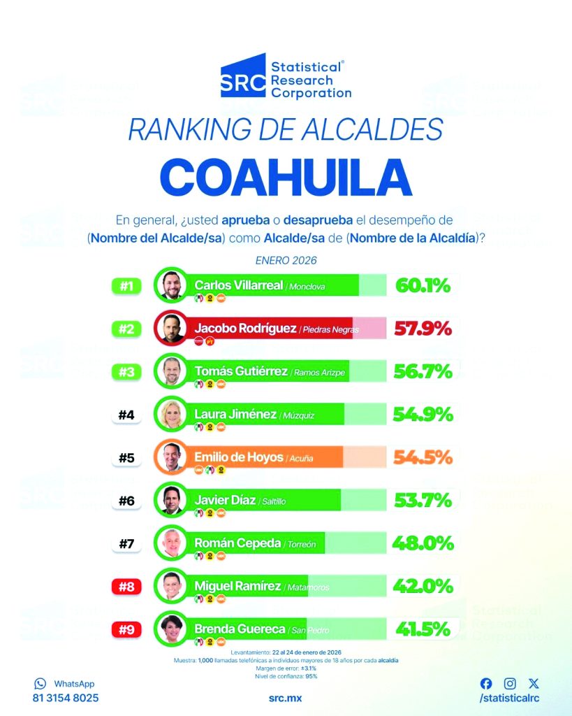 El Alcalde de Monclova, Carlos Villarreal, se colocó en el primer sitio de aprobación entre ediles de Coahuila, alcanzando un 60.1 de aceptación ciudadana, de acuerdo con datos de la agencia Statistical Research Corporation.