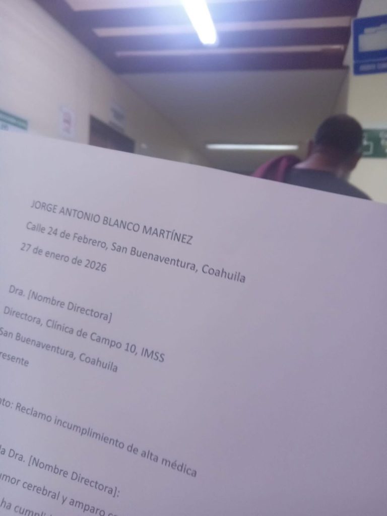 El paciente Jorge Antonio Blanco Martínez, residente de San Buenaventura, Coahuila, presentó un nuevo reclamo formal ante la dirección de la Clínica de Campo 10 del Instituto Mexicano del Seguro Social (IMSS) en esa localidad, exigiendo el cumplimiento inmediato de una alta médica que, según afirma, cuenta con respaldo de un amparo judicial concedido, de lo contrario iniciará huelga de hambre extrema.