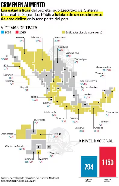 Al cierre de 2025, el delito de trata de personas aumentó 45%, al pasar de 794 en 2024 a mil 150 el año pasado, lo que representa mensualmente 96 víctimas.