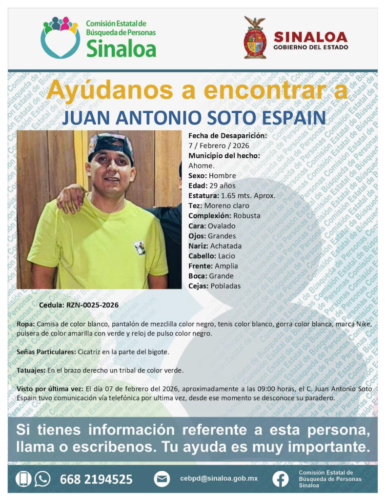 La Comisión Estatal de Búsqueda de Personas pidió la colaboración ciudadana mediante los números (668) 688 98 60 y (668) 219 45 25, así como el correo [email protected], para aportar cualquier dato que ayude a dar con el paradero de los desaparecidos.