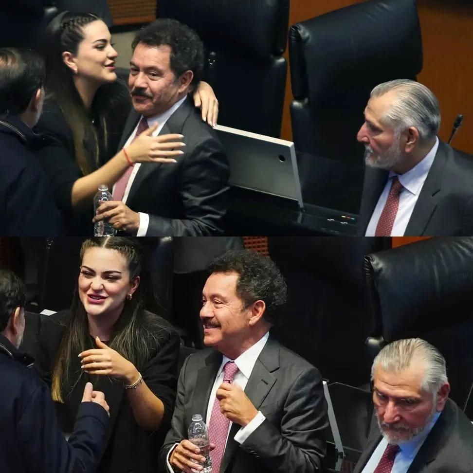 En primer plano, la efusividad: Ignacio Mier Velazco, vicecoordinador de la bancada de Morena, comparte un momento de camaradería y sonrisas con su compañera de partido, la senadora Andrea Chávez Treviño.