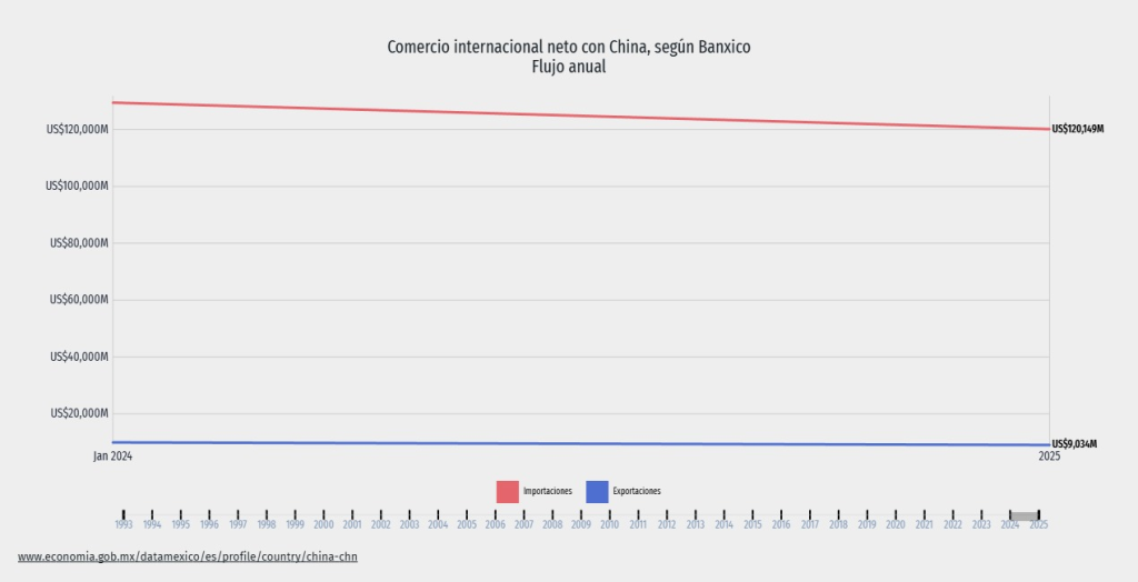 Cifras del Banco de México (BdeM) actualizadas ayer indican que en 2025 el país importó mercancías de China por un valor de 133 mil 270 millones de dólares, cifra marginalmente superior a los 129 mil 457 millones de dólares reportados en 2024.