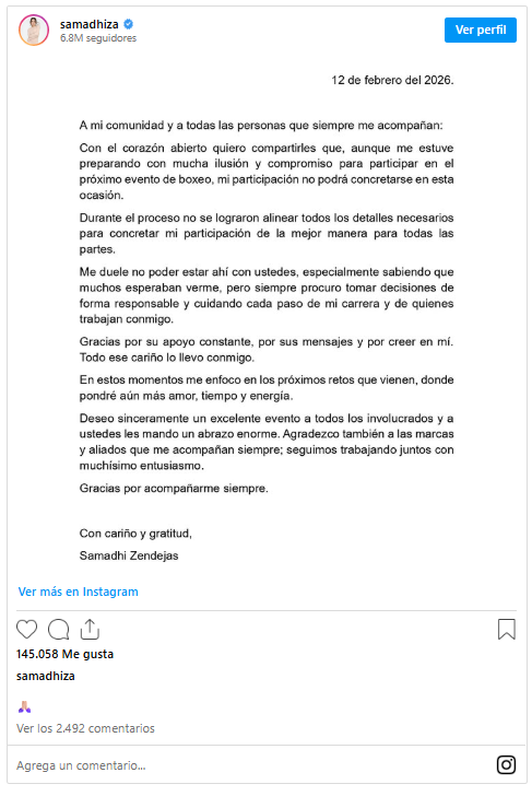 En el mensaje explicó que, pese a su proceso de preparación, no se lograron alinear los elementos necesarios para formalizar su presencia en el combate ante Alana Flores, quien figuraba como su rival en la pelea principal de Supernova Génesis 2026.