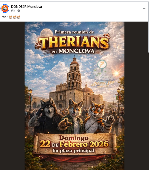 En Saltillo, una publicación de la página NEXT SHOW Saltillo anuncia un “Mega Convivio Therian” para el mismo sábado 21 de febrero en el Parque Las Maravillas.