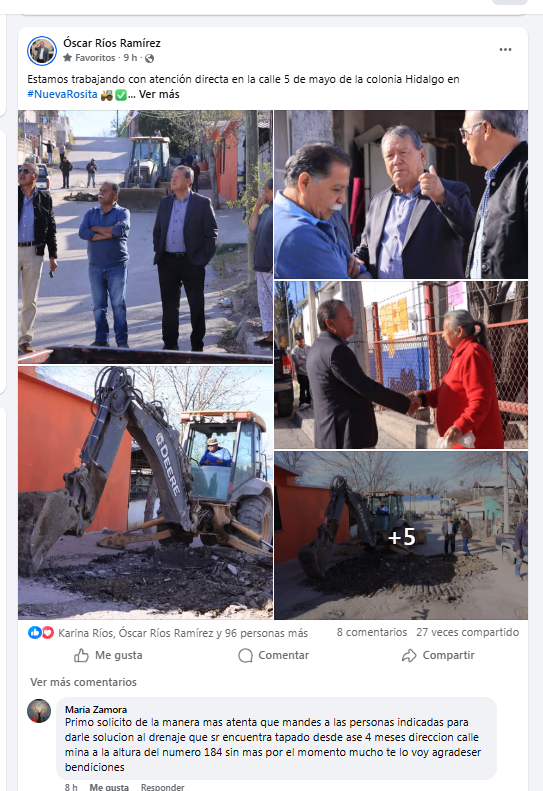NUEVA ROSITA, COAHUILA. – A más de un año de gestión, el alcalde de San Juan de Sabinas, Óscar Ríos, enfrenta crecientes críticas en sus plataformas digitales. Mientras el edil utiliza sus redes sociales para supervisar obras ejecutadas por el Gobierno del Estado y presumir la adquisición de luminarias, los ciudadanos denuncian que sus peticiones de auxilio son sistemáticamente borradas.