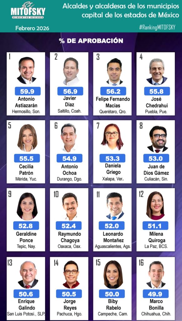 De acuerdo con el Ranking Mitofsky de alcaldes y alcaldesas de capitales del país, correspondiente a febrero de 2026