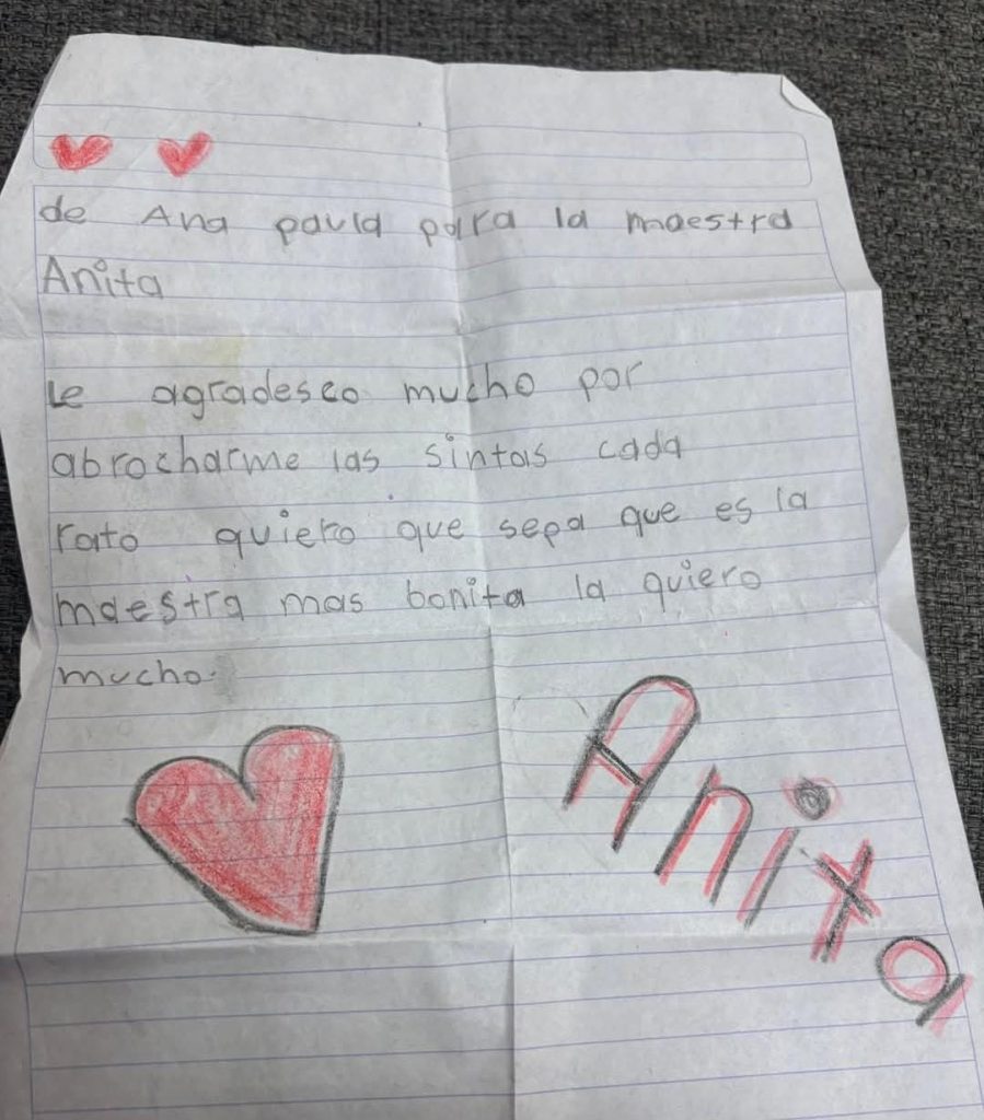 “De Ana Paula, para la maestra Anita, le agradezco mucho por abrocharme las cintas a cada rato, quiero que sepa que es la maestra más bonita, la quiero mucho”, expresa la pequeña Ana Paula en su carta.