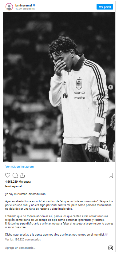 En una publicación de Instagram, Yamal reaccionó contra los aficionados que cantaron “musulmán el que no brinque” en el amistoso ante Egipto.