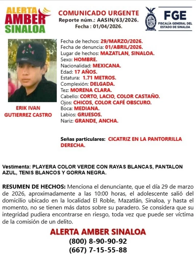 La Fiscalía General del Estado de Sinaloa (FGE) reportó la desaparición de dos menores de edad el 3 y 29 de marzo en el municipio de Mazatlán, aunque las denuncias fueron puestas hasta el 1 de abril.