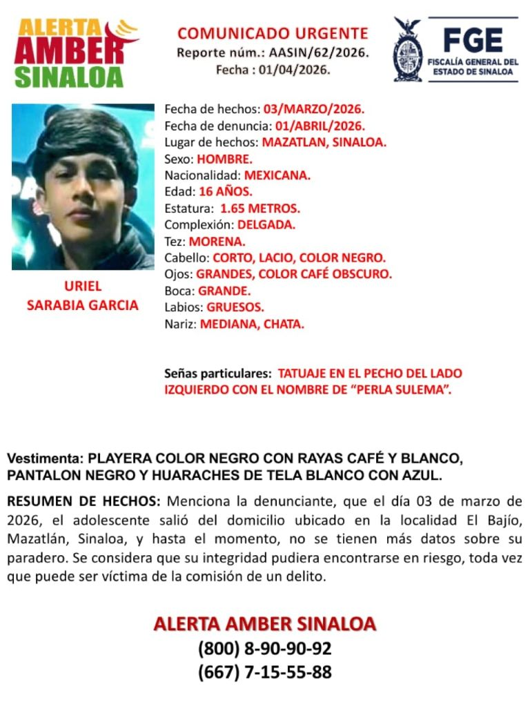 Para facilitar su reconocimiento, la ficha describe que el menor tiene un tatuaje en el pecho del lado izquierdo con el nombre de “Perla Sulema”. Mide 1.65 metros de altura es de tez morena y delgado. Su cabello es corto lacio de color negro cuyos ojos son grandes y cafés.