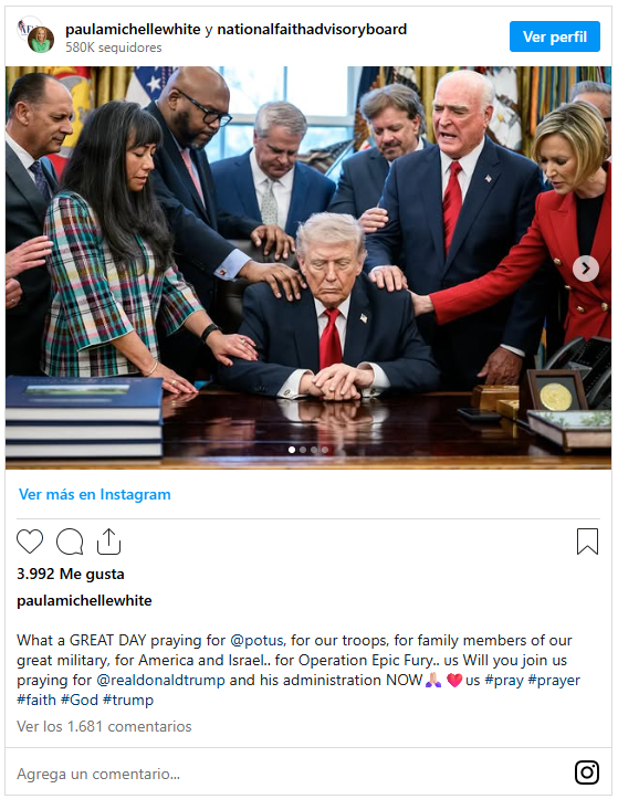 Cabe recordar que el pasado 5 de marzo, Paula White realizó una oración grupal con el presidente en la Oficina Ovalpor las tropas, loas familias de los militares, Estados Unidos, Israel y la operación “Epic Fury”, lo que también desató críticas por hacer uso de la residencia para ese tipo de actos religiosos.