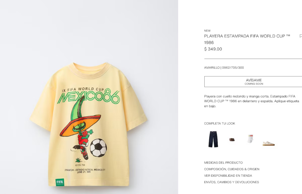 Entre las prendas destaca una playera amarilla de algodón con estampado “FIFA WORLD CUP 1986”, cuello redondo y manga corta, con un precio de 349 pesos mexicanos, disponible en tienda en línea y puntos físicos.
