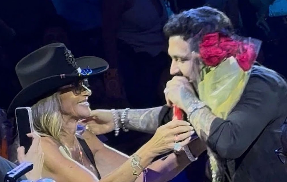 Durante la presentación de Nodal en el Palenque de Aguascalientes, Adela Micha se hizo notar entre el público al entregar un ramo de flores al cantante.
