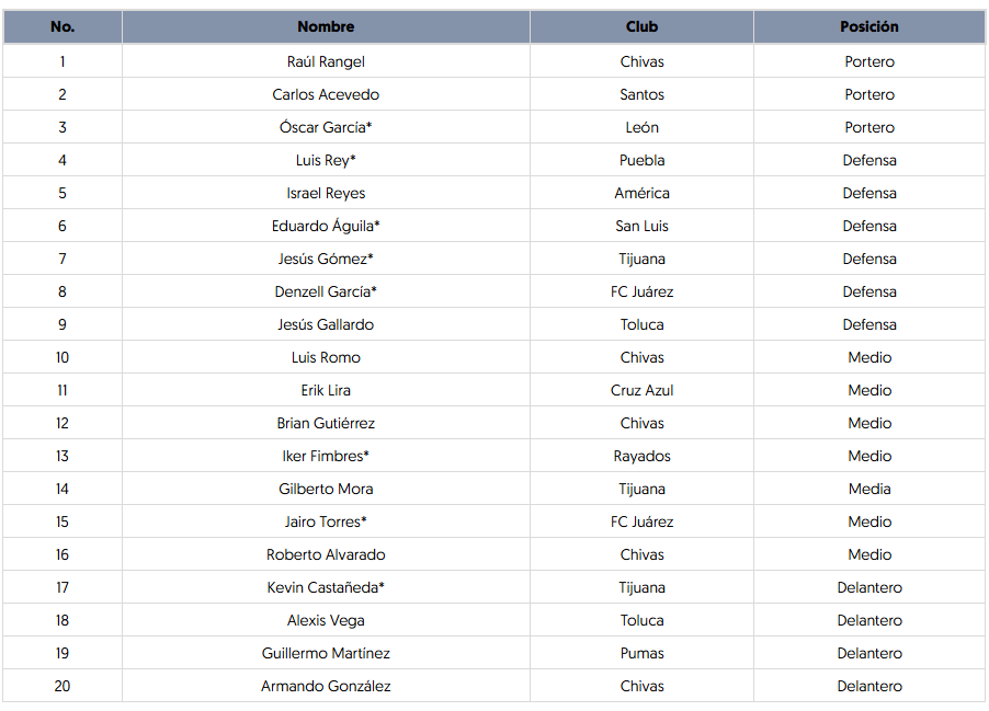 Cabe destacar que los jugadores marcados con asterisco forman parte del grupo de sparrings, es decir, futbolistas que acompañarán a la Selección Mexicana como apoyo en los entrenamientos y en el proceso de preparación, pero que no están contemplados, en principio, para la lista final del Mundial.