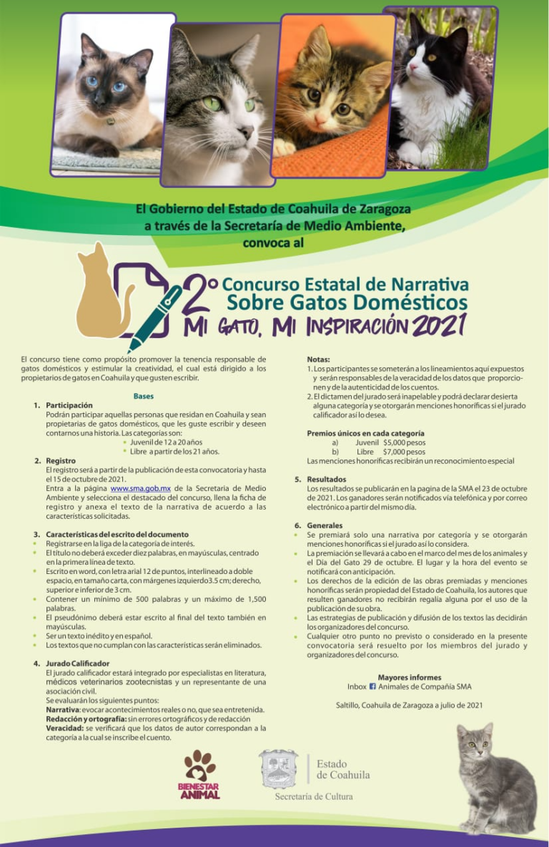 El Gobierno del Estado de Coahuila, a través de la Secretaría de Medio Ambiente (SMA), convoca al 2º Concurso Estatal de Narrativa Sobre Gatos Domésticos...